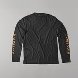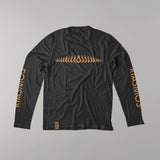 Front and sleeve print on a black Stanley & Stella Shifts Dry long sleeve shirt, with embroidered tag.
